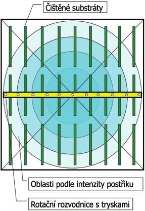 | Obr. 14 Rotační systém trysek a účinky na testovací substrát po 20 min (substrát umístěn v polovině délky ramen | Obr. 15 Maticový systém trysek s oscilací koše a účinky na testovací substrát po 20 min |