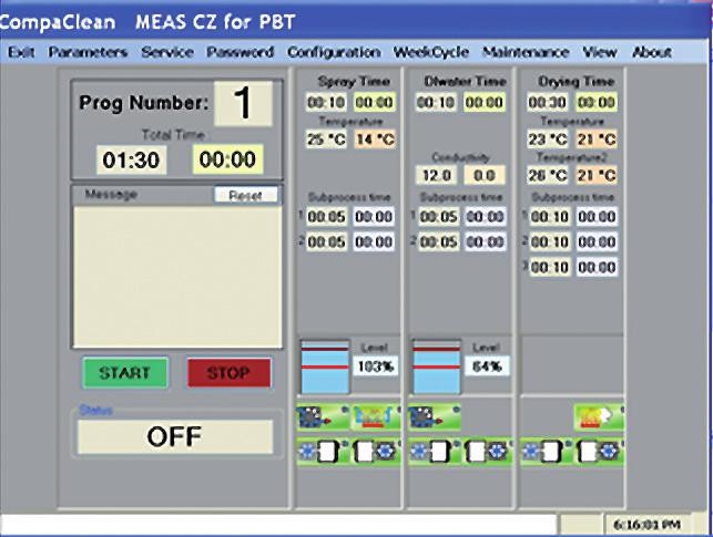 | Obr. 18 Přehledová maska SW se všemi důležitými parametry a stavy agregátů | Obr. 19 Udržbová maska SW – ovládání vyčerpání a napouštění lázní |