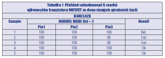 Tabulka 1 shrnuje vyhodnocení souboru 5 vzorků výkonového tranzistoru MOSFET Fast diode SuperMESH s obohacovaným kanálem typu N provedeného na našem pracovišti. Před analýzou nebyl určen vzorový tranzistor. Ten byl vybrán náhodně.