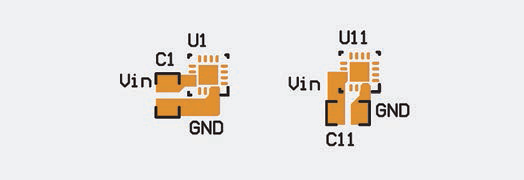 Umístěte vstupní kondenzátor tak blízko k IO, jak to jen pravidla pro osazení desky povolují. Propojení s IO je provedeno pomocí měděné plochy. Takové široké a krátké spojení minimalizuje indukčnost plošného spoje. Až v kroku 5 přidáte propojovací otvory (via) k napojení na napájení a zem systému, protože nyní to není tak důležité. Obr. 2 ukazuje správnou vzájemnou polohu obou součástek a způsob jejich propojení, a to ve dvou variantách (C1 a C11, U1 a U11). Vývod 1 obvodu IO je v pravém dolním rohu.