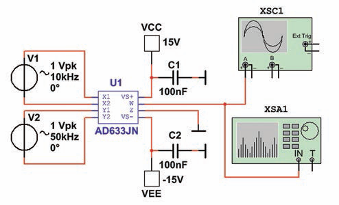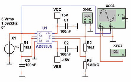 Obvod AD633 firmy Analog Devices je skutočne univerzálnym obvodom, pomocou ktorého sa dajú realizovať obvody pre prax bez toho, aby sme museli použiť veľké množstvo súčiastok a zložitú schému zapojenia. Viac informácií sa dá nájsť v katalógovom liste. Mojou úlohou bolo priblížiť vlastnosti obvodu pomocou simulačného programu MultiSIM.