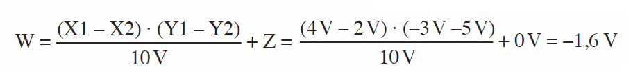 Na obr. 3 je schéma zapojenia a výsledky simulácie činnosti štvorkvadrantovej násobičky. Po pripojení obvodu A k výstupu W a vstupu Z sa výstupné napätie vypočíta zo vzťahu.