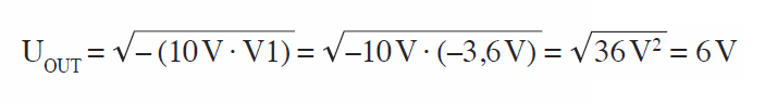 Na obr. 6 je obvod umocňovania a delenia napätia. Pri umocňovaní privádzame na vstup napätie, ktoré musí byť menšie ako nula, teda záporné. To je podmienka správnej činnosti obvodu odmocňovania. Výsledné napätie sa vypočíta zo vzťahu [9].