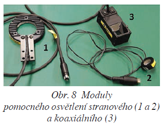 Varianty osvětlení při optické analýze testovaných součástek mohou rovněž sehrát významnou roli v zájmu zvýraznění důležitých optických znaků, které jsou projevem nepůvodnosti nebo použité analytické technologie, jakou je laserová nebo chemická ablace části pouzdra. Osvětlení analyzované součástky můžeme volit kolmé nebo stranové, nejčastěji prstencem světelných diod. U kolmého osvětlení, které bývá součástí mikroskopu, nám při kratších ohniskových vzdálenostech objektivu nemusí prstenec stačit k osvětlení celé plochy vzorku, především čipu odkrytého ablací. V takovém případě oceníme pomocný koaxiální světelný zdroj využívající polopropustného zrcadla, jak je tomu u mikroskopů vyšší cenové kategorie. Světelný zdroj je umístěn ze strany, tedy mimo optickou osu mikroskopu. Běžné světelné zdroje pro optickou mikroskopii poskytují bílé světlo. Ovšem výběr světelného zdroje s vlnovou délkou v oblasti červené, modré nebo zelené barvy může přinést zvýraznění některých detailů, v bílém světle nepostřehnutelných. Boční osvětlení dává plasticky vyniknout strukturám v kolmém světle nepozorovatelným. Následující obrázky jsou ilustračním výběrem k tématu pomocného osvětlení při optické analýze součástek, ať již se jedná o počáteční vizuální podchycení rozdílů mezi vzorovou součástkou a jejími testovanými alternativami, nebo se například jedná o optickou analýzu výsledků ablace materiálu pouzdra v oblasti čipu a obrazovou analýzu čipu samotného. Na obr. 8 je skupina tří modulů pomocného osvětlení. Modul s číslem 1 je prstencové stranové osvětlení bílým světlem většího průměru a modul s číslem 2 pak představuje prstencové stranové osvětlení červeným světlem menšího průměru. Modul číslo 3 představuje příklad koaxiálního osvětlení bílým světlem.