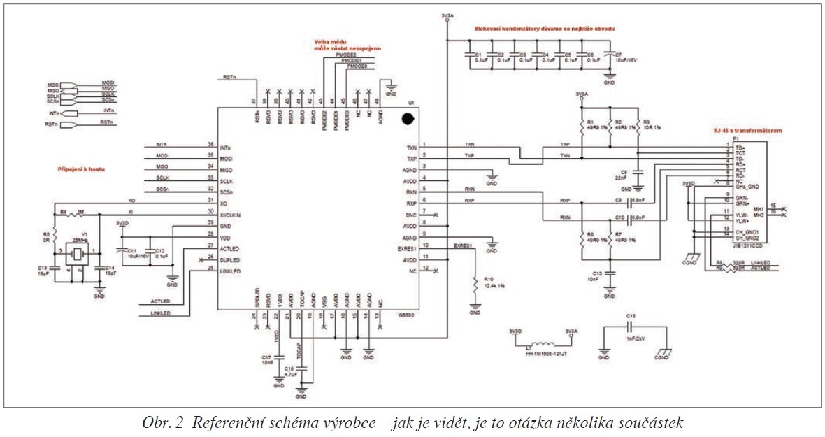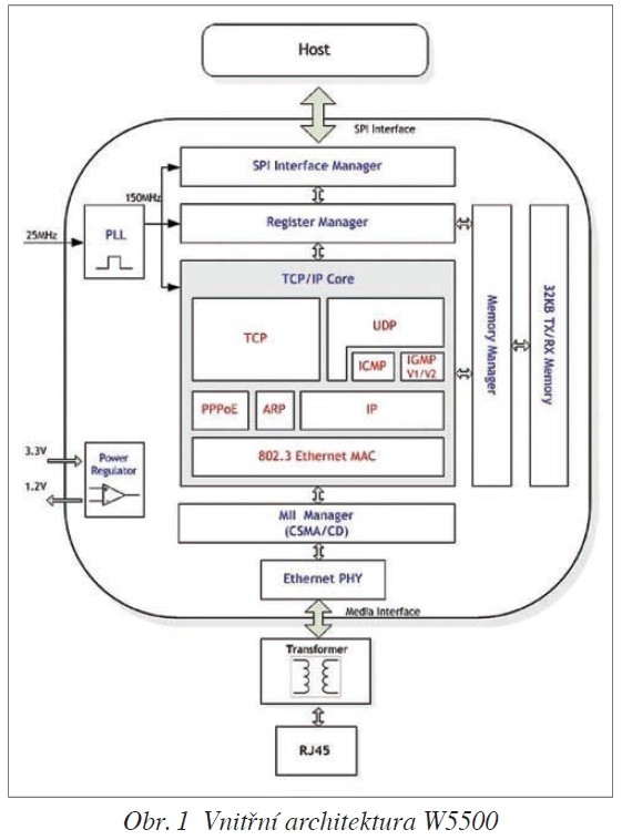 Obvod rozhraní W5500 zvládá 10/100Base-T a disponuje i fyzickou vrstvou, takže k samotnému obvodu stačí připojit transformátor, konektor RJ-45 a jsme na Ethernetu (i na Internetu). Na druhé straně (obvodu) máme k dispozici standardní rozhraní SPI. Výrobce deklaruje, že je to hardwired TCP/IP, to znamená, že by uvnitř neměl běžet žádný „ARM“. Z dalších základních vlastností obvodu bych rád zmínil:
