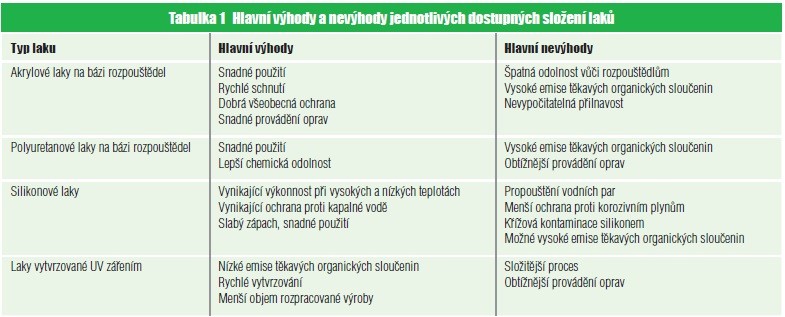Hlavní výhody a nevýhody jednotlivých dostupných složení laků jsou shrnuty v tabulce 1.