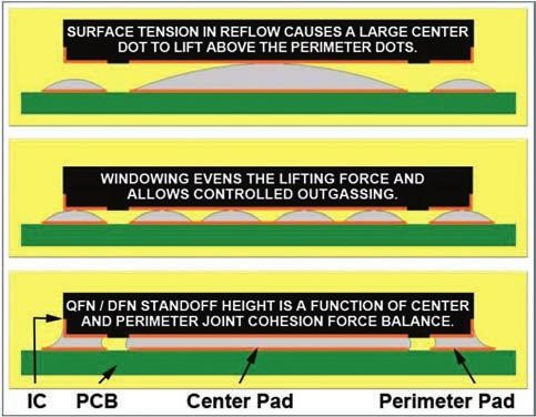Většina QFN pouzder má kovovou plošku uprostřed spodní strany pro uzemnění a odvod tepla. DFN pouzdra mají podobnou kovovou plošku, ale své kontaktní vývody mají pouze na dvou stranách pouzdra. Běžná tloušťka QFN součástky je 0,85 mm a její půdorys má rozměry 3–12 mm, takže pouzdra jsou velmi malá a také velmi lehká. Kontaktní plošky QFN pouzdra a jeho zemnící ploška jsou v jedné rovině na spodní straně pouzdra. Nátisk pájecí pasty na zemnící plošku v jedné velké dávce způsobí, že QFN pouzdro bude během reflow operace plavat a vývody pouzdra se tak vůči pájecím ploškám na desce plošných spojů posunou. Plavání QFN pouzdra může být omezeno snížením množství pájecí pasty nanesené na plošce desky sloužící pro uzemnění součástky. Většinou se problém s plaváním QFN pouzdra vyřeší při snížení o 50 až 60 %. Zmenšení apertury se však musí provést na základě důkladného posouzení situace. Ve většině případů se doporučuje rozdělit dávku pájecí pasty na několik menších. To také umožní nadbytečné pájecí pastě volný „odchod“ během reflow procesu, aniž by se QFN pouzdro posunulo. Toto řešení je zachyceno na obr. 1 – v jeho horní části je vidět stav, kdy dávka pájecí pasty na zemnící plošce desky přečnívá pájecí pastu na vývodech, zatímco prostřední část ukazuje navrhované řešení rozdělením jedné dávky na několik menších. Spodní část obrázku potom zobrazuje výsledek pájení.