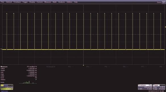 Jako praktický příklad si ukážeme analýzu signálu s pulzní šířkovou modulací (PWM). Na analogový kanál osciloskopu C1 přivedeme měřený signál. Do parametru P1 nadefinujeme měření kladné části pulzu (Width) a zvolíme zobrazení i statistiky a malého histogramu (Histicon). Výsledek měření po prvním spuštění časové základny vidíme na obr. 2. Osciloskop nám ihned poskytuje informaci o okamžité hodnotě měření (Value), střední hodnotě (Mean), minimální hodnotě (Min), maximální hodnotě (Max), standardní směrodatné odchylce (Sdev) a počtu měření (Num), ze kterých byla statistika vypočtena. V tomto případě je počet měření 23, protože v prvním běhu časové základny bylo zachyceno právě 23 pulzů. Po několika okamžicích, kdy narůstá počet provedených měření, pak statistika vypadá tak, jak je uvedeno na obr. 3. Zde už vidíme, že bylo vyhodnoceno celkem 14 812 měření. Maličký histogram nás pak na první pohled informuje např. o tom, že šířka pulzu se nemění spojitě, ale v signálu je devět diskrétních šířek pulzu, přičemž delší pulzy jsou zastoupeny častěji než pulzy kratší.