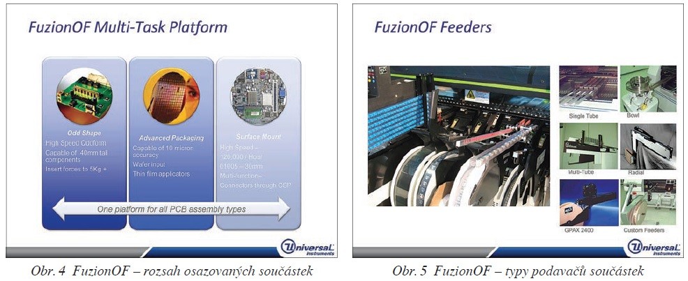 Při zavádění nových produktů do výroby je důležitým parametrem zvládnutí přechodu z výroby vzorků do velkosériové výroby. Na tomto poli vyniká svými produkty společnost Universal Instruments (USA) s osazovacími automaty řady Fuzion. Na semináři byl k vidění flexibilní osazovací automat řady FuzionOF, který zvládá osazovat velmi široký sortiment součástek – obr. 4. Tomu odpovídají i různé možnosti podávání součástek – obr. 5. Obecně platforma Fuzion vyniká rychlým přechodem z vzorkové do sériové výroby – především díky vyspělému softwaru pro NPI (New Product Implementation). V praxi se jedná o účinné nástroje, jak vyrobit již první DPS při prototypové výrobě bez chyb.