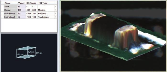 Moderní 3D AOI systémy počítají nejen s referenční výškou, ale také s úhlem naklonění referenční roviny. To je nezbytné pro kompenzaci nerovností povrchu DPS, zvláště u malých „tombstone“ defektů nebo u kontroly koplanarity BGA součástek. Kompenzace musí být provedena pro každé zorné pole (FOV) zvlášť, jelikož DPS může být také prohnuta nerovnoměrně. Na příkladu inspekce pouzdra čipové komponenty, viz obr. 10, je prověřována výška a úhel naklonění (inklinace v ose X a inklinace v ose Y) roviny komponenty vůči naklonění povrchu DPS. Výsledek průměrné výšky je v tomto případě 499 μm, což je v toleranci pro pouzdra 0402 čipových rezistorů. Inklinace v ose X (thombstone) je 15 μm a v ose Y (billboard) je 8 μm. Obě hodnoty jsou tedy v tolerancích.