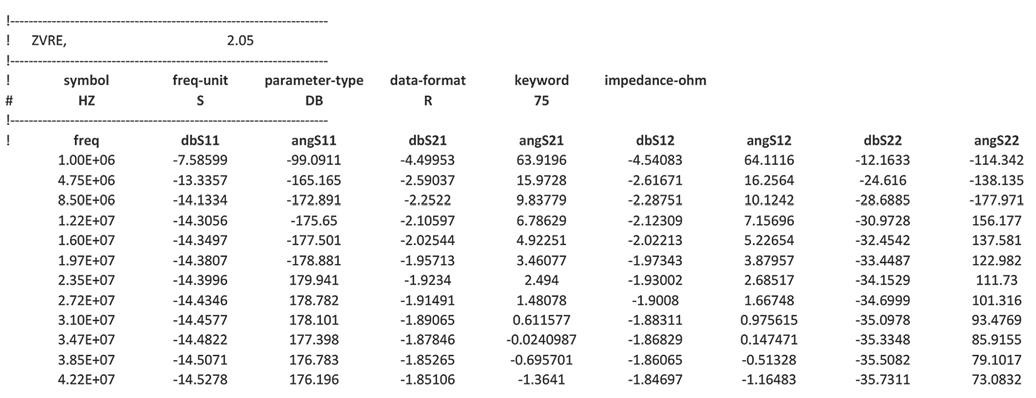 Tabuľka 1 Súbor S-parametrov v TOUCHSTONE formáte