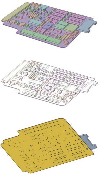 Obr. 3 Deska načtená přes IDF interface z programu PADS bez použití 3D modelů (nahoře vyplněný model v perspektivním zobrazení, uprostřed drátový model s potlačením neviditelných hran, dole náhled během otáčení)