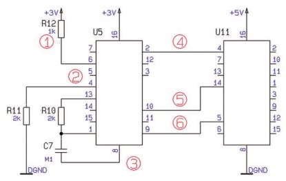 2 - vývod 5 nezapojen na DGND, 3 - spoj mezi U5:8 a C7 nepřipojen na DGND,
