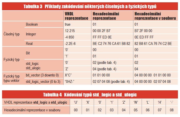 Jednobitový číselný typ boolean je v souboru reprezentován celým jedním bytem. Podobnou vlastnost využívají i ostatní fyzické typy bit, std_logic a std_ulogic. Poslední dva zmiňované typy nabývají i jiných hodnot než jenom log.0 nebo log.1 podle tabulky 4.