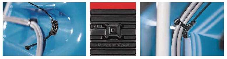 Ohebný úchyt kabelové vázací pásky (28 × 28 × 6,3 mm) drží prakticky na jakémkoliv povrchu (sklo, hliník, syntetické materiály, nátěry, práškový lak). Úchyt je vyroben z teplovzdorného polyamidu a hodí se tedy pro permanentní použití při teplotách od –40 až do +150 °C. Instalace je rychlá a snadná a snižuje náklady při montáži na míru. Na rozdíl od vrtání či šroubování nepoškozuje lepicí úchyt lakované povrchy a snižuje riziko vzniku koroze. Usnadňuje i instalaci kabelů na špatně přístupných místech.