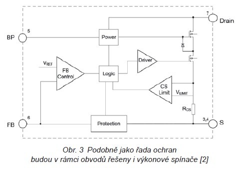 Řešení s blokovým diagramem na obr. 3 převádí celovlnně usměrněná střídavá napětí v rozsahu od 85 VAC až do 265 VAC na jmenovitou výstupní hladinu 8,0 VDC. V přímém zapojení se obejdeme bez transformátoru, takže stačí jen obsloužit vývody interních výkonových MOSFETů, Drain a Source, zapojit kapacitu pro vnitřně řešené napájení řídicích obvodů (BP), zavést zpětnou vazbu (FB) a máme hotovo. Pokud jde o potřebnou bezpečnost a spolehlivost, výrobce pamatoval na možné překročení teploty (OTP), funkci podpěťového zámku, ochranu pro případ zkratu na výstupu (SCP), stejně tak i situace, kdy zde dochází k přetížení (OLP), a nakonec řeší rovněž otázky spojené s přerušením obvodu. Interní MOSFETy zvládají v případě nejvyšší varianty snižujícího zdroje 700 V (BVDSS), vykazují odpor v sepnutém stavu 10,5 Ω, nabízí kmitočtovou modulaci potlačující elektromagnetické interference a napěťovou regulaci zajišťují v mezích ±5 %. Podporovány jsou jak režimy DCM, tak též CCM.
