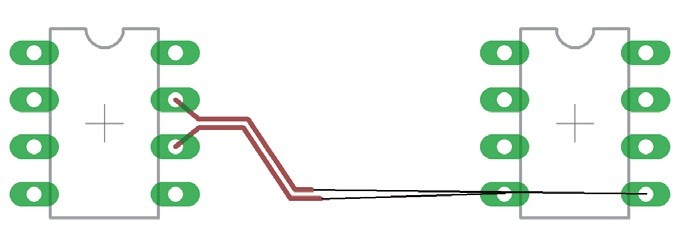 Akýkoľvek plošný spoj: Meander sa začne vytvárať v bode prvého kliknutia a pokračuje až do bodu posunutia myšou. Výška meandra je daná vzdialenosťou myši od vodiča. Ak jeden meander nestačí k vyrovnaniu rozdielu dĺžky, je možné pridať ďalší v inej oblasti spoja.