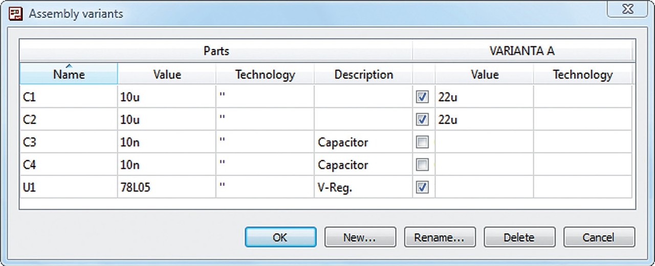 Príkazom VARIANT (alebo z menu Edit/Assembly variants...) sa spustí dialógové okno so zoznamom použitých súčiastok podľa ich označenia a hodnôt. Tlačítkom New sa v dialógovom okne vytvorí nová varianta osadenia dosky automatickým vložením nového stĺpca. V novom stĺpci sú automaticky vybrané všetky súčiastky označením zelenou fajkou. Ak niektorá súčiastka nemá byť osadená, jej výber sa zruší odkliknutím príslušnej fajky. Ak má mať niektorá súčiastka inú hodnotu, tá sa zapíše do stĺpca Value. Ak je v knižnici súčiastok k dispozícii viac technológií danej súčiastky, v stĺpci Technology sa dá upresniť požadovaný typ pre danú variantu.