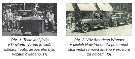 Zato některé vozy zkonstruované ve 20. letech minulého století byly už poměrně dobře zdokumentovány. Jedním z nich bylo malé vozidlo určené pro převážení různých nákladů, pravděpodobně pro vojenské účely [2]. V srpnu 1921 ho na letecké základně McCook v Daytonu (Ohio) veřejnosti představila americká armáda. Jednalo se o jakousi 2,5 metru dlouhou „rakev“ na třech kolech, která jela zcela samostatně (obr. 1). Princip spočíval v elektronicky ovládaném řízení tohoto vozítka, které probíhalo z vojenského nákladního auta jedoucího s 30metrovým odstupem za ním.
