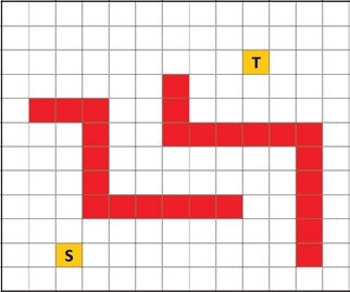 Obr. 1a Mřížka s umístěním překážek, S a T