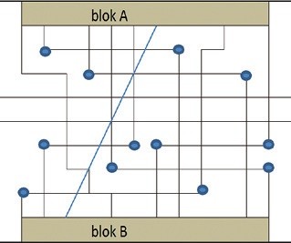 Snahou algoritmu je uspořádat segmenty vzhledem ke kapacitě kanálu tak, aby propojení bylo realizováno podle návrhových pravidel, eventuálně, aby se kanál mohl zúžit, a tak dosáhnout minimalizace rozměrů čipu, pokud stejnou strategii uplatníme na všech kanálech propojovacího prostoru. Propojení, které má být provedeno v našem kanálu, je zobrazeno na obr. 2b. Podobnou situaci jako na čipu můžeme najít v praxi na deskách plošných spojů. Jak je vidět na obrázku, kanál může být využit i cizími spoji, které ho využívají jako průchozí, tím samozřejmě snižují kapacitu kanálu a možnosti propojení mezi bloky A a B. Zatímco u dříve popisovaných algoritmů šlo o jednoduché, intuitivní postupy při hledání cesty, v tomto případě nastupuje poměrně složitý aparát z teorie grafů, jehož cílem je srovnání segmentů v kanálu co nejoptimálněji.
