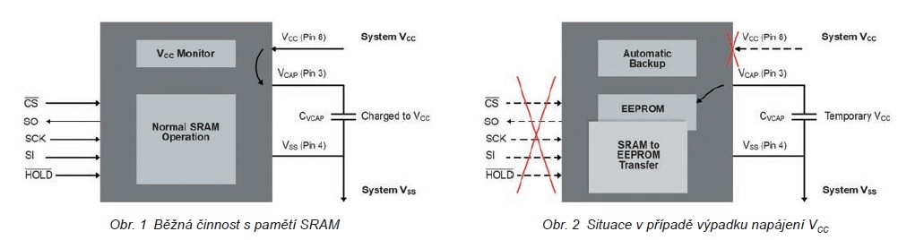 Na obr. 1 si povšimněte externího kondenzátoru CVCAP (typicky 33 μF), který bude nezbytné zapojit pro zajištění nonvolatilní činnosti paměti SRAM. Po prvním přivedení napájecího napětí pro paměť EERAM je kapacita prostřednictvím součástky nabita na úroveň VCC. Po dobu obvyklé činnosti paměti typu SRAM zůstává kondenzátor nabitý (VCC), zatímco hladina systémového napětí VCC je součástkou dále monitorována. Jakmile však VCC klesne pod nastavený práh, součástka si to „vyloží“ jako výpadek napájení či brown-out. Jak vyplývá z obr. 2, prvek pozastaví veškeré operace se vstupy a výstupy, odpojí se od vývodu VCC a energii uloženou v kapacitě použije k napájení součástky, tentokrát přes vývod VCAP. Smyslem je přemístit veškerá data z paměti SRAM do EEPROM. Při následujícím obnovení napájení VCC budou data přemístěna zpátky do paměti SRAM, kondenzátor je znovu nabit a původní činnost může pokračovat přesně tam, kde také skončila.