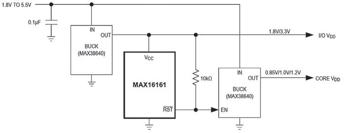 Obr. 3 Součástky rovněž využijeme při jednoduchém řízení posloupnosti napájení – zde konkrétně s verzí MAX16161 vybavenou vstupem MR [2]