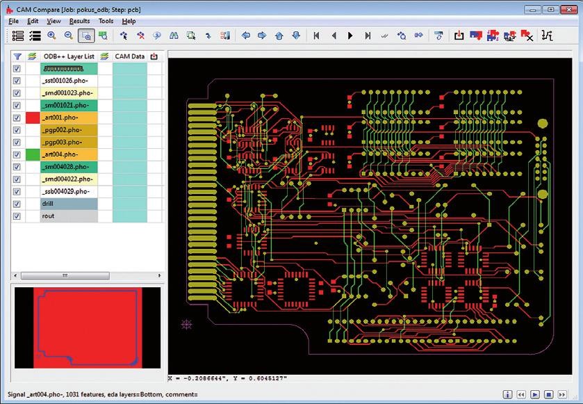 Zejména možnost porovnání výsledků obou formátů je velmi vítaným doplňkem výstupní kontroly dat dodávaných do výroby. Program automaticky porovnává grafiku výstupu ODB++ s grafikou Gerber dat pro zvolenou vrstvu a signalizuje různé nesrovnalosti. Pro účel porovnání se musí Gerber data vygenerovat ještě před exportem desky do ODB++.