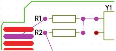 | Obr. 1 Follow Route – plošný spoj postupně sleduje obrysy několika vybraných objektů | Obr. 2 Příklad pro definování associated net – spoje přes rezistor R1 |