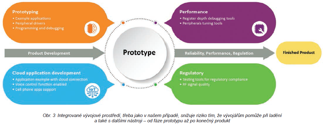 Aby to dávalo skutečně smysl, měl by daný výrobce poskytnout úplné IDE (viz také obr. 3), které bude počítat s každou analogovou i digitální funkcí vykonávanou takovým Wi-Fi mikrokontrolérem, včetně všech externích součástek vyžadovaných při realizaci konkrétního zadání. Hodit se budou i prostředky sloužící k vizualizaci toho, jak se změny v návrhu dotýkají celkových vlastností, resp. schopnost vyhodnotit vf parametry návrhu, stejně jako shodu s příslušnými směrnicemi. Některé ze základních nástrojů jsou k dispozici zdarma, zatímco u jiných se již něco málo platí. Patří sem i vývojové desky navržené s ohledem na rodinu Wi-Fi MCU konkrétního výrobce.