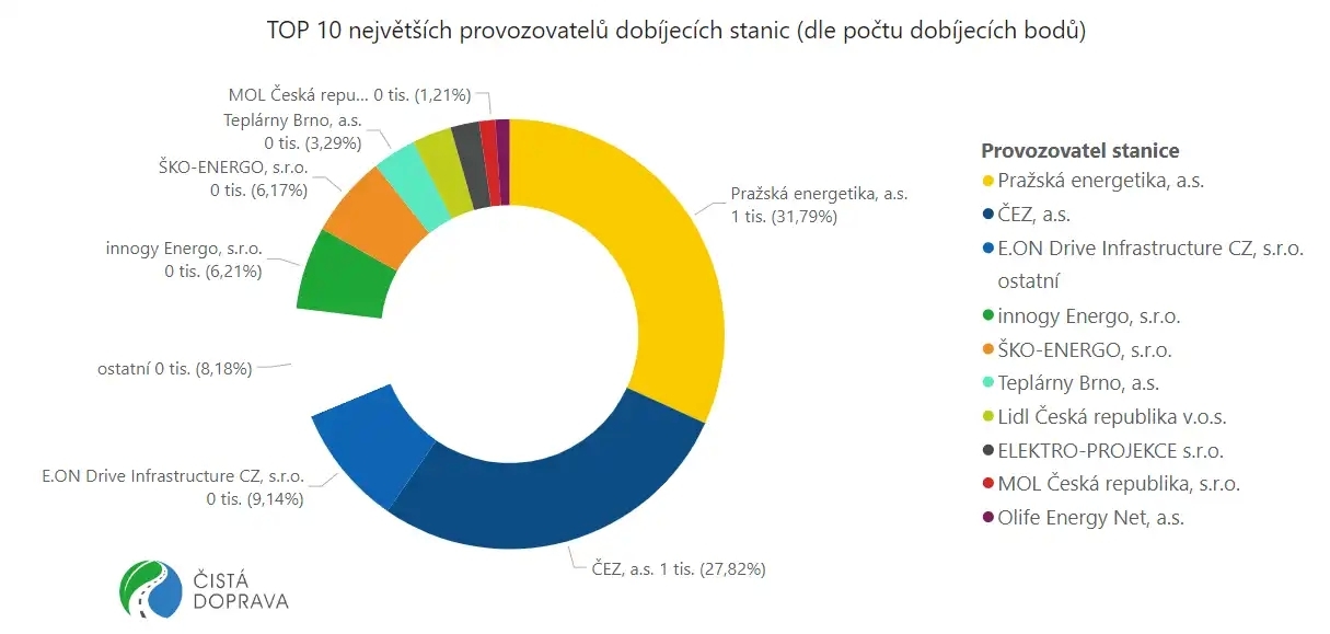 Celkem 120 subjektů provozuje v Česku veřejnou dobíjecí infrastrukturu. Nejvíce veřejných dobíjecích bodů provozuje Pražská energetika (1 371; 31,8 %), následuje ČEZ (1 200; 27,8 %) a E.ON Drive (394; 9,1 %). K dalším významným provozovatelům veřejné dobíjecí infrastruktury v Česku patří Innogy Energo, ŠKO-ENERGO, Teplárny Brno, Lidl ČR, ELEKTRO-PROJEKCE, MOL ČR a Olife Energy Net.