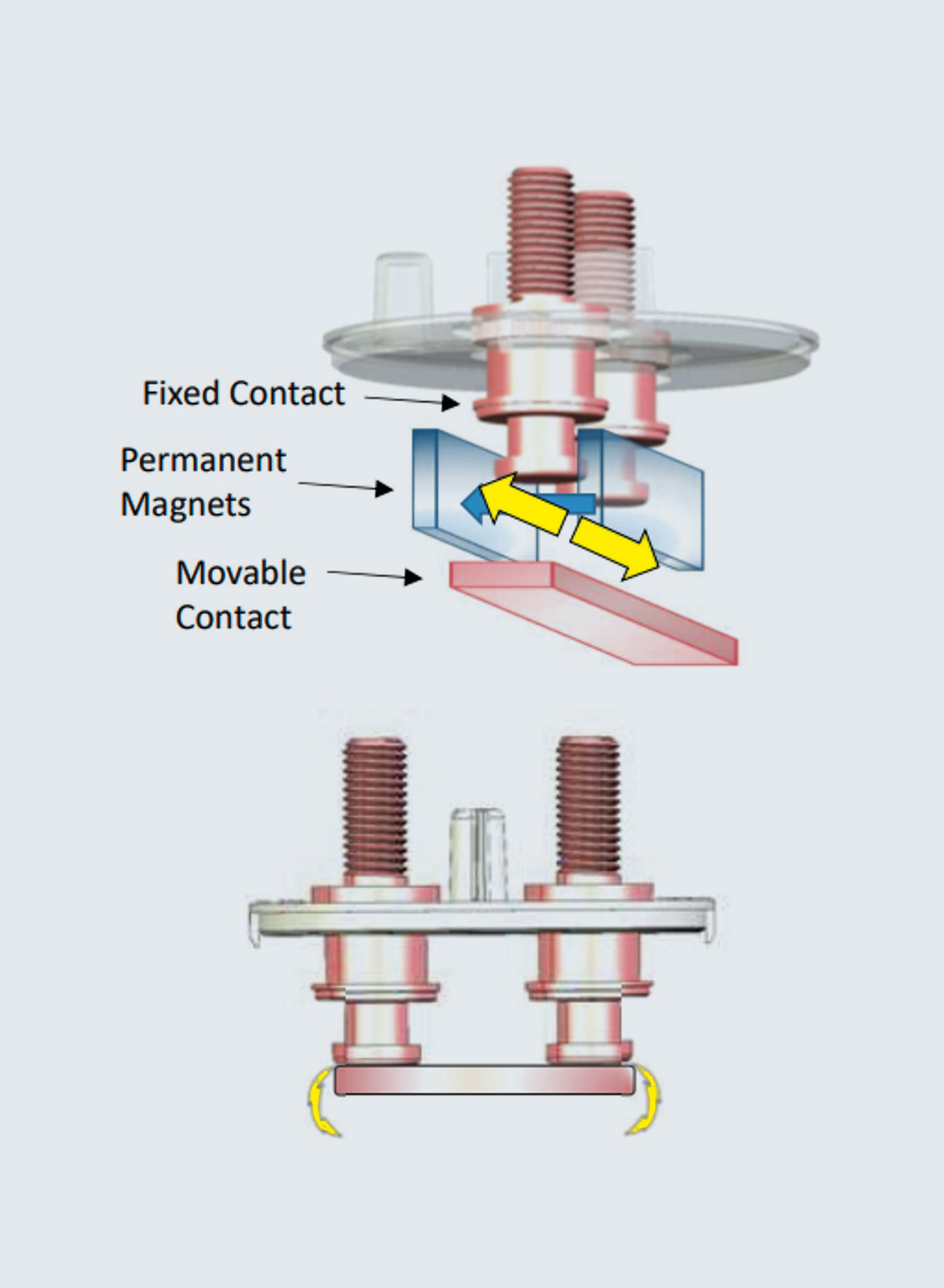 V komoře s kontaktem se nachází speciální magnetické řešení − jedna z klíčových součástí a funkcí DC stykačů ALTRAN, především proto, že realizuje hlavní funkci při maximálně rychlém zhášení oblouku, což také zajišťuje odolnost samotného produktu.