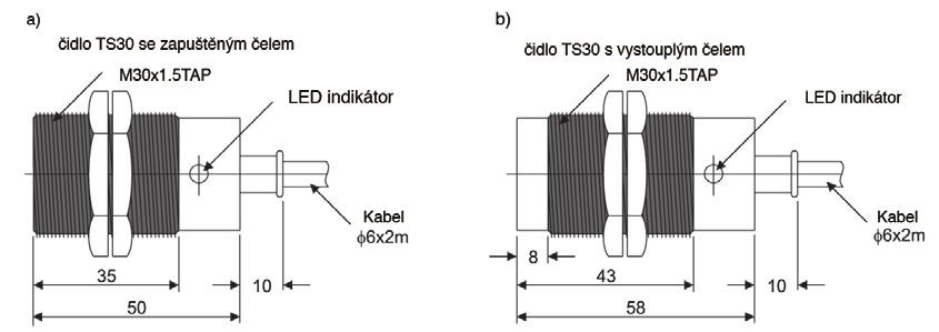Druhým důležitým parametrem součástek tohoto typu je charakter a rozsah napájecího napětí. Čidla rodiny TS jsou uzpůsobena k napájení stejnosměrným napětím v rozsahu 10 V až 30 V, s přípustným zvlněním peak-to-peak řádu max. 10 %. Výstupy však nemusejí být připojeny bezprostředně ke zdrojům napětí, čidla jsou rovněž odolná vůči změně polarity napájecího napětí. Zatěžovací odpor musí být zvolen tak, aby proud ve výstupním obvodu nepřekročil 100 mA. Čidla TS mohou přímo ovládat relé, elektroventily (za předpokladu max. výstupního proudu 100 mA), spolupracují rovněž s PLC automaty běžně používanými v průmyslové automatizaci. V závislosti na způsobu připojování zátěže volíme konfiguraci výstupu čidla. V rodině TS jsou dostupná všechna provedení, se kterými se setkáváme v praxi a to: PNP/NO, NPN/NO (NO=s výstupy v klidu rozpojenými), PNP/NC, NPN/NC (NC=s výstupy v klidu sepnutými), (obr. 2). Při volbě čidla musíme navíc zohlednit typ jeho čela. Provedení s vystouplým čelem se vyznačují větším dosahem než analogická provedení se zapuštěným čelem (tab. 1). Všechna čidla TS se k obvodu připojují dvoumetrovým kabelem vyvedeným přímo z pouzdra. Kabel je při vyústění z těla čidla chráněn zesíleným gumovým límcem.