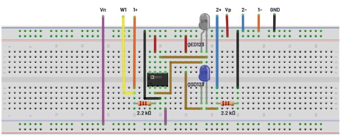 Nejdříve si vyrobíme svůj vlastní optočlen a použijeme k tomu infračervenou LED s fototranzistorem NPN dodávané v sadě „Analog Parts Kit“ ADALP2000. Pokud pro tato laboratorní cvičení sadu se součástkami nevyužíváte, můžete je nahradit obdobnými prvky, nicméně dosahované výsledky se mohou v závislosti na zvolených součástkách lišit.